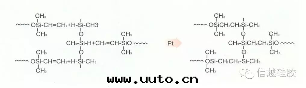 LIMS用(yòng)液态矽橡胶(jiāo)的固化(huà)機(jī)制如(rú)下图(tú)所(suǒ)示,通(tòng)常進(jìn)行加成(chéng)反(fǎn)應(yìng),該反(fǎn)應(yìng)利用(yòng)加热(rè)来進(jìn)行固化(huà),随温(wēn)度(dù)的升(shēng)高(gāo)而(ér)縮短(duǎn)固化(huà)时(shí)間(jiān)。