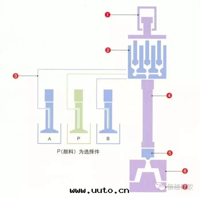 LIMS用(yòng)的液态矽橡胶(jiāo)在(zài)常温(wēn)下其(qí)粘度(dù)为(wèi)50-2,000Pa.s,因(yīn)此要(yào)选用(yòng)适合这(zhè)个(gè)粘度(dù)範圍的成(chéng)型機(jī)。注射成(chéng)型系(xì)统基本(běn)上(shàng)是(shì)由(yóu)定(dìng)量(liàng)排出(chū)泵單元(yuán)和(hé)带(dài)有動(dòng)态攪拌器或(huò)静(jìng)态攪拌器等混合裝(zhuāng)置的注射單元(yuán)所(suǒ)組成(chéng)。通(tòng)常可(kě)使用(yòng)由(yóu)这(zhè)些(xiē)部(bù)件(jiàn)緊湊組成(chéng)的高(gāo)精度(dù)LIMS专用(yòng)注射成(chéng)型機(jī)。
