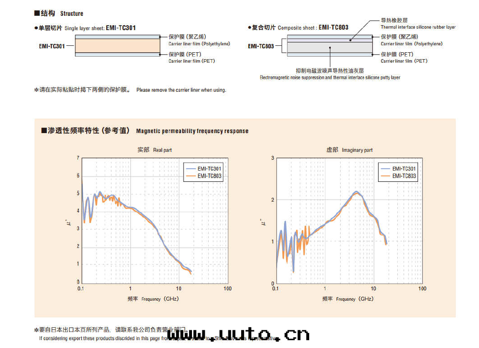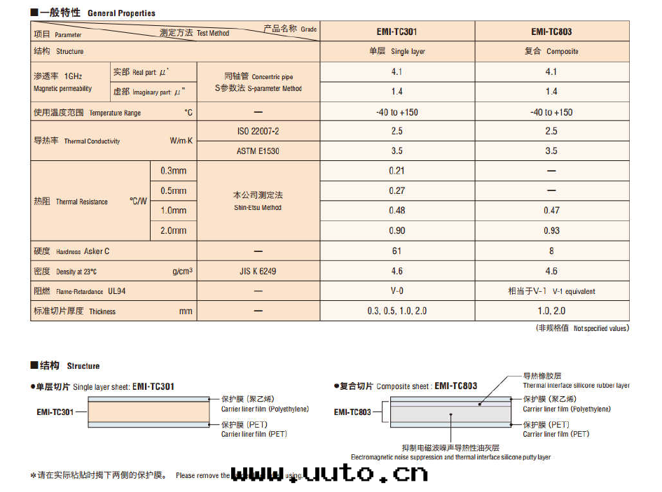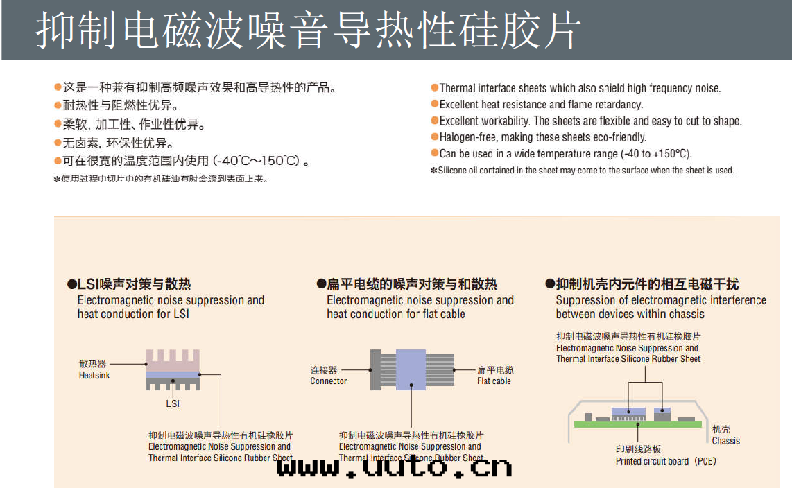 産品说(shuō)明:这(zhè)是(shì)一(yī)種(zhǒng)兼有抑制高(gāo)頻噪聲效果(guǒ)和(hé)高(gāo)導热(rè)性(xìng)的産品。 耐热(rè)性(xìng)和(hé)阻燃性(xìng)優异(yì)。 柔软(ruǎn),加工性(xìng)、作(zuò)業性(xìng)優异(yì)。 無鹵素,环(huán)保性(xìng)優异(yì)。 可(kě)在(zài)很宽(kuān)的温(wēn)度(dù)範圍內(nèi)使用(yòng)(-40℃~150℃)